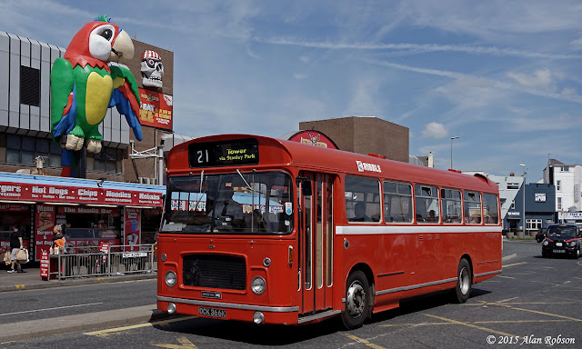 | Palladium branded Centro bodied Volvo 527 seen leaving Market St in Blackpool for Lytham on service 11 |