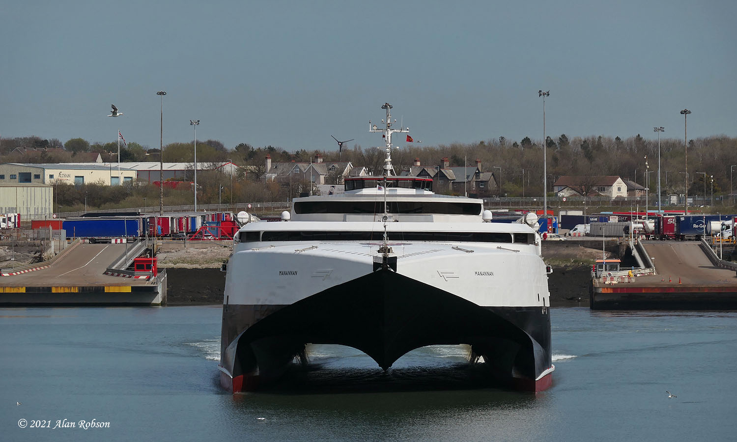 The Isle of Man Steam Packet Company high-speed catamaran Manannan has been running on the daily Douglas to Heysham ferry service this week, replacing the usual conventional ship on the route. The regular ferry that operates out of Heysham, the Ben-my-Chree, has been dry-docked at Cammell Laird in Birkenhead since Monday 19th April for her annual regulatory overhaul.HSC Manannan was built by Incat of Tasmania in Australia in 1998, and from 2001 until 2008 the high-speed vessel operated as a military transport with the United States Navy under the name 'Joint Venture', she was painted overall grey and fitted with a helideck at the aft end. In 2008 the catamaran was purchased by the Isle of Man Steam Packet Company, and after a 3 million pound refit she entered passenger service from Douglas in May 2009. The Manannan normally operates a seasonal service between Douglas and Liverpool, and in winter is kept as a reserve ferry.